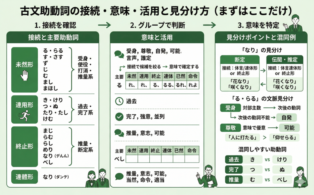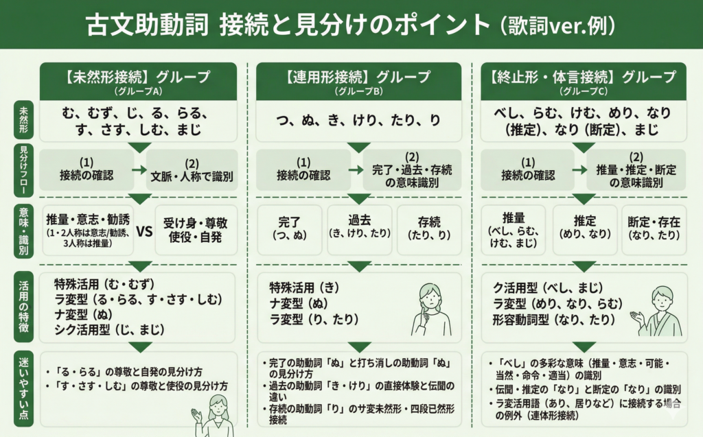 助動詞は意味から覚えるより、まず接続で候補を絞るほうが古文では速く安定します。このページでは、歌で覚える方法と接続一覧を使って、未然形・連用形・終止形・体言連体・りの見分け方を、本文でそのまま確認できる形にまとめています。