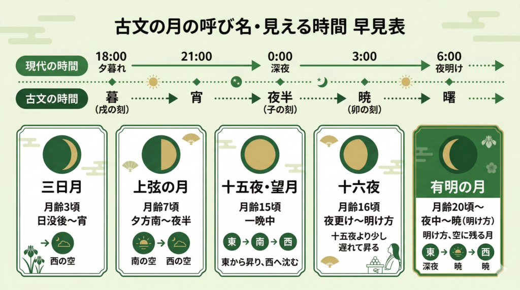 | 呼び名 | 旧暦の目安 | 月の形 | 見える時間帯(昇る→南中→沈むの目安) | 古文でのヒント(即答) |