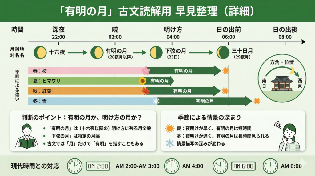 月の呼び名を覚えていても、本文でそれが何時ごろの場面を示すのか結び付かないと、読解では使い切れません。月名・月齢・見える時間帯を読解で使える形に整理したい方は、月の呼び名と時間帯を読解で使える形に整える個別ワンポイント講座もあわせて活用してください。