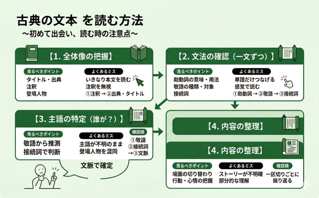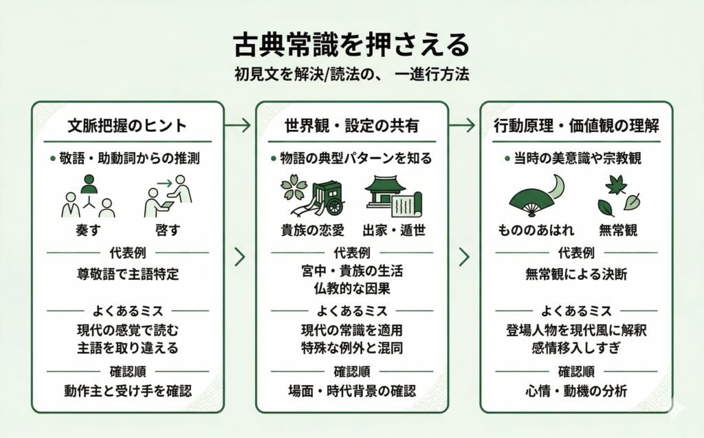 - 初見文で途中からずれるのは、文法の抜けだけでなく、話の見通しや古典常識の不足でも起こります。