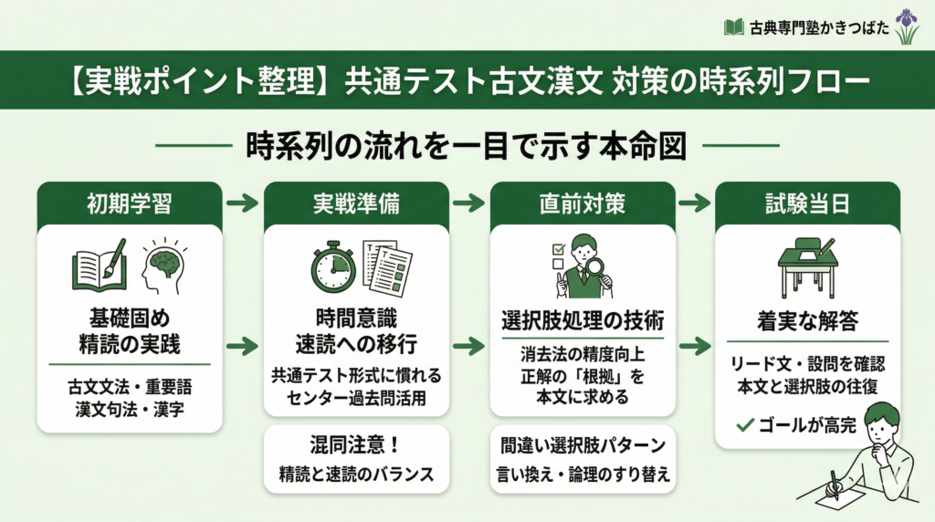 共通テスト古文漢文では、特別な裏技よりも、選択肢の見方・設問の使い方・戻り方・時間配分を自分なりに固めておくことが点数に直結します。