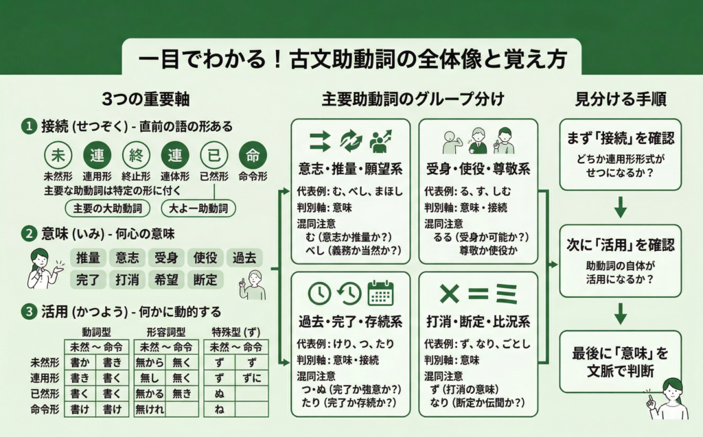 - 接続(つき方):未然・連用・終止などを確認。重いときは歌・一覧も活用 → 歌で覚える古典の助動詞